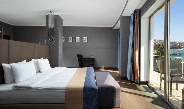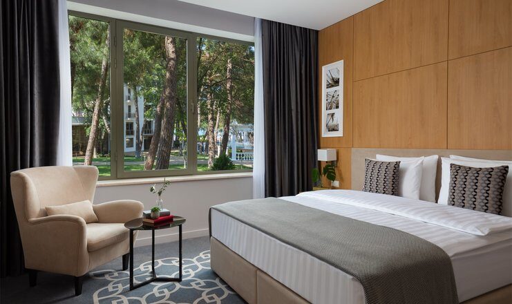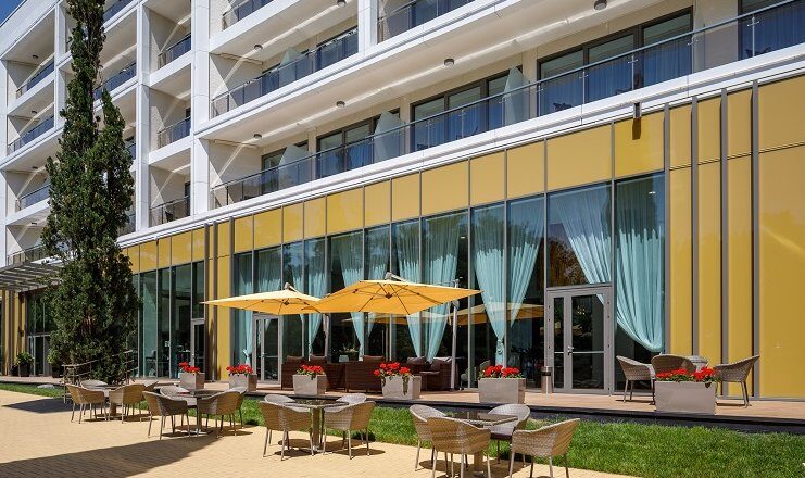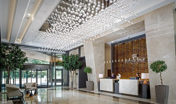 Отель Приморье занимает закрытую от посторонних территорию площадью 5 гектаров, расположенную у самого берега моря. Комплекс включает в себя шесть комфортабельных спальных корпусов разной звездности: четыре 3-х этажных корпуса, один корпус в 8 этажей и один корпус в 5 этажей, а также клинику «Ланцет», связанную теплым переходом с одним из корпусов. На территории отеля есть отдельно стоящее четырехэтажное здание Wellness-центра, развлекательный комплекс и несколько ресторанов на побережье.