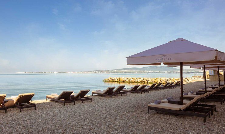 У отеля Приморье собственный мелко-галечный пляж, расположен напротив спальных корпусов. На пляже работают кафе, душевые, раздевалки, теневые навесы от солнца, шезлонги и лежаки.